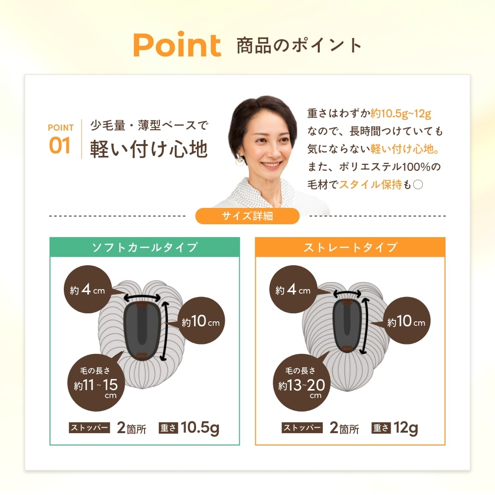 タイプ/サイズ 部分ウィッグ ブランド Swanee ヘア素材 ポリエステル100% カラー イエローブラウン(YB4) スタイル ナチュラル 製法 半手植え ストッパー数 2個 重さ 約12g
