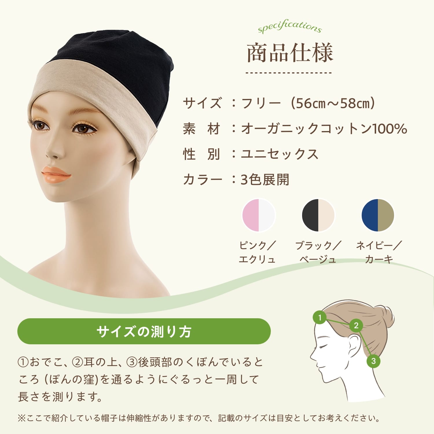 頭皮が敏感になっていますので、しめつけず肌触りのよい素材、肌に優しく、安心してお使いいただける商品をお選びください