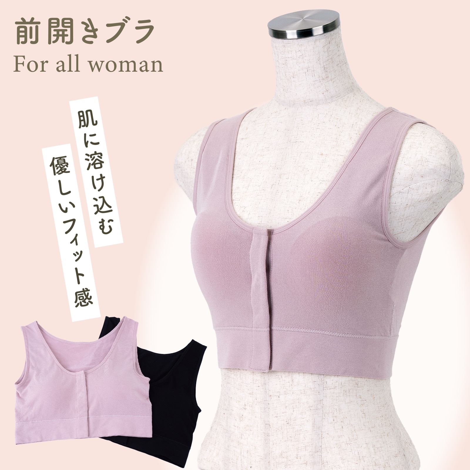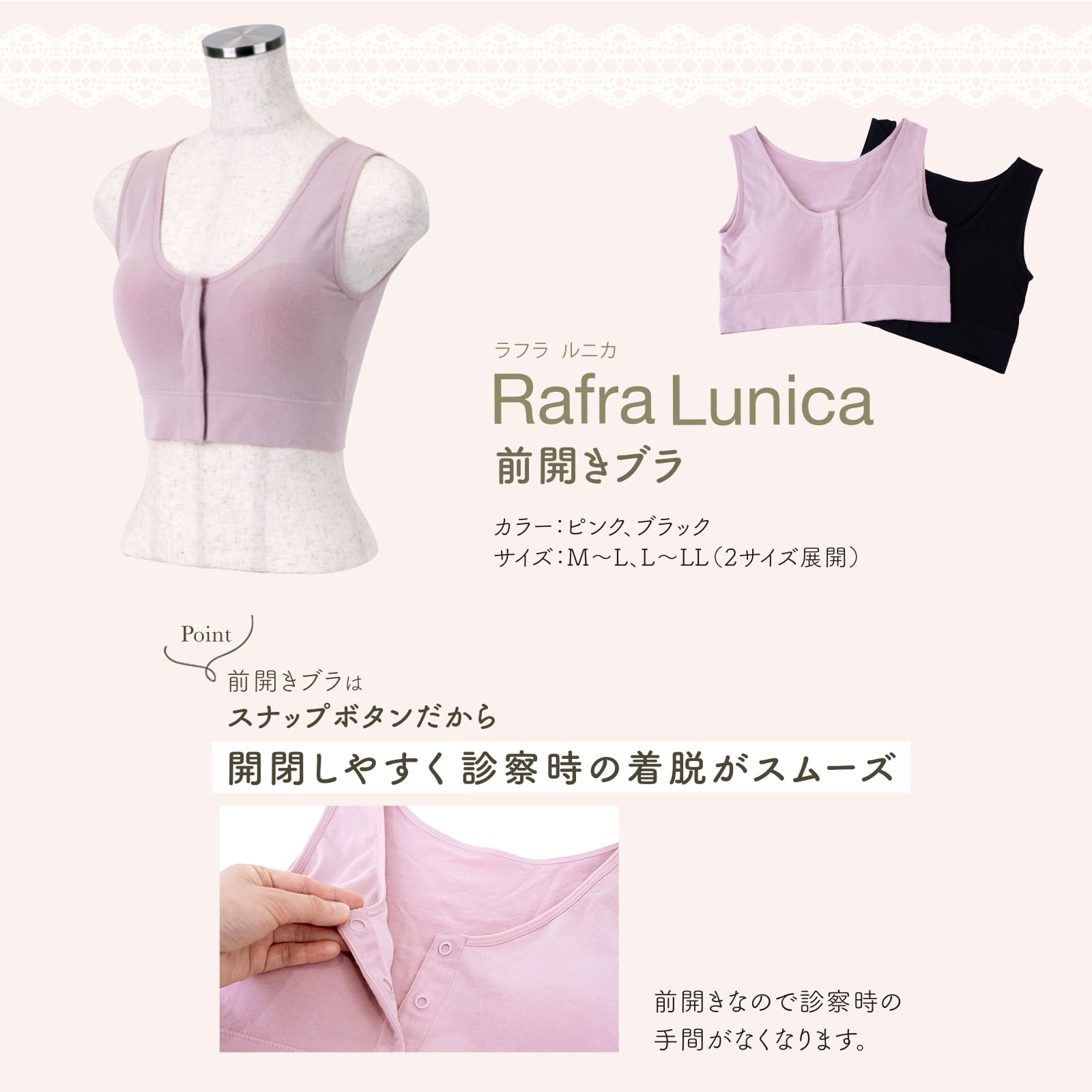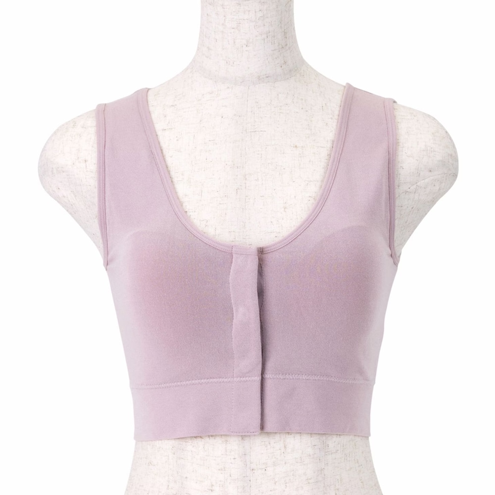 着衣したままでも留め外ししやすいよう、前側にスナップボタンを配置したブラジャーです。ブラジャーや衣服を大きくずらすことなく診察や処置が行え、医療現場でのスムーズな対応もサポートできるよう考慮しました。乳房切除をされない方や術後の回復中、病気やケガ、ご高齢で腕を後ろに回しにくい方、授乳中の方など幅広い需要に対応できる点が特長です。